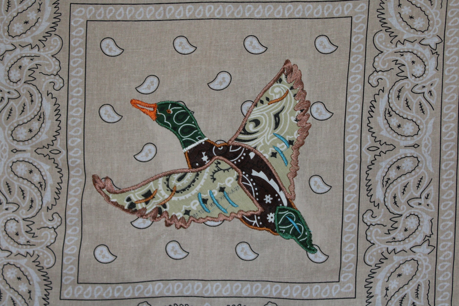 Embroidered bandana on bandana appliqué featuring a mallard duck.