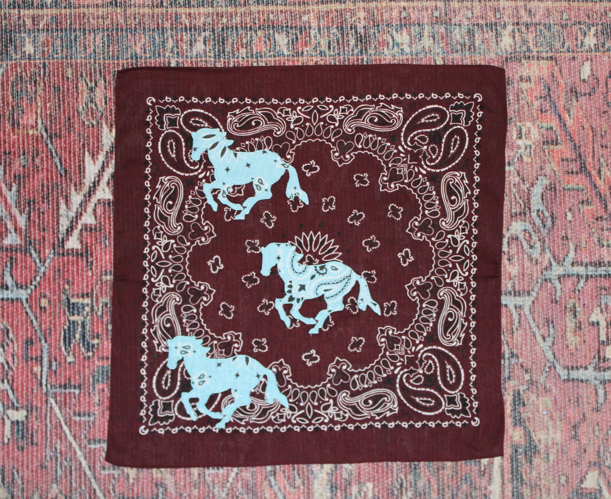 Embroidered bandana on bandana applique featuring 3 running horses. Light blue on burgundy backdrop.